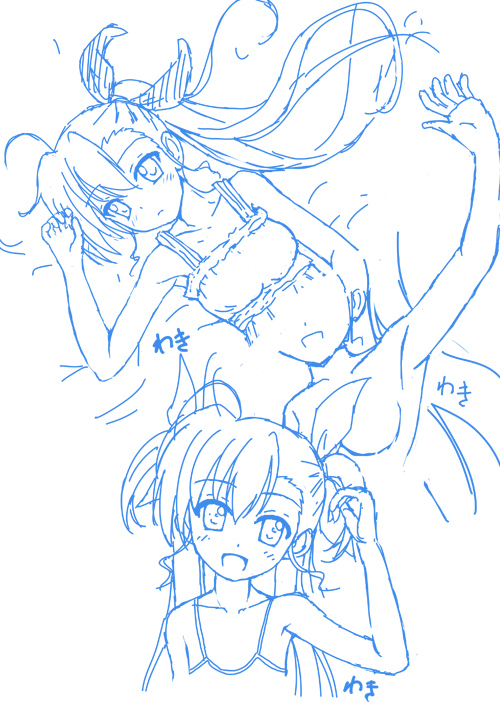 ■愛里寿らくがき 新刊のガルパン本、表紙はこれでどうでしょう!(またか ![]() あんまり露骨にM字開脚させると品が無くなってしまうので、そこは控えめに。 愛里寿ちゃんはお嬢様ですからね。 まぁ、お嬢様が品無く乱れる・・・そのギャップに燃える、という心意気は当然理解できますけどもw ちなみに言うまでもなく本では差分あり、というかクマ無もありで。 ■練習 わき練習。なぜかヴィヴィオさん。 ![]() わきって多くの方にとってはかなりフェチ度の高いポイントだと思うのです。 胸のあたりから脇の下にかけて、じっとりと汗ばんだ肌を舐め上がりたいっ!(変態 そのような行為は世の紳士のほぼ100%が抱く願望と言えるでしょう。 なので、まぁ当然のことながら絵に描いた際も訴求力が高いと思います。 出来れば積極的に描いていきたいところです。わき。 でも、いざ描こうとするとこれがなかなか難しいですね。肩や胸から腕にかけての筋肉がどうなってるのか、その辺をある程度分かってないと描けないです。 実を言うと私もあんまりよく分かってないです。人体の皮をはいで筋肉をむき出しにしたような図は、ネットにもいくらでもありますけど、あまりに複雑で、どこがどうなってんだか見てもよく分かりませんw。 しかもそれが実際に動いた際にどうなるかなんて、なおのことわけがわからなくなります。 脇を描く際の参考として、ポイントを絞るとしたら、三角筋や大胸筋のあたりですかねぇ。 まぁ、劇画調のリアルな絵を描きたいわけではないので、もちろん省略やデフォルメはありでしょうけど、基本的なところが分かってないと、省略やデフォルメのしようもないわけで。 やっぱり基礎は大事ってわけですよね〜。練習あるのみですね。