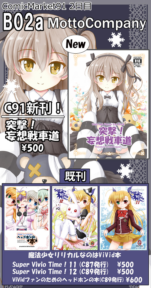 いよいよ冬コミが迫ってまいりました。気づけばもう明後日は1日目なんですよね。早いものです。 ちょっと遅くなってしまいましたが、ウチのサークルの今回のお品書きはこんな感じです! ![]() 今回のブランニューな出し物は新刊のみとなります。マグカップとか作りたかったんですけど、マグはだんだんニーズも無くなってきてそうだなと思ったので、今回は作りませんでした。 既刊については、今回はガルパン島で2日目の参加なので、「なのはViVid本を持ち込むのはどうかなぁ」って思ったんですが、新刊一種のみでは机上が寂しいですし、一応持っていくことにしました。よろしければ新刊と合わせてお手に取ってみていただければと思います。 ではでは、皆さま、2日目にお近くをお通りの節は東B−02a「MottoCompany」にぜひお立ち寄りくださいませ! 皆さまとお会いできるのを楽しみにしておりますよ〜!