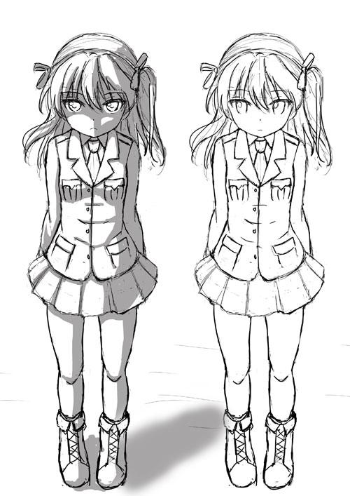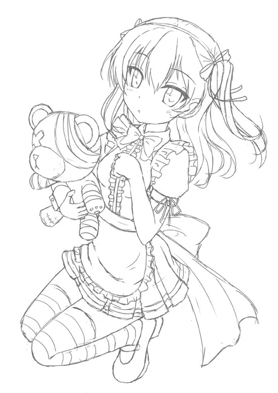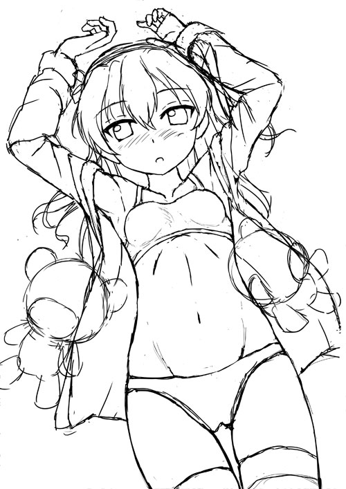 同人誌の表紙絵というものについていろいろ悩んでます。 表紙絵のレイアウトというか構図というか、そういうのってある程度パターンがありますよね。 特に18禁作品の場合はアピールしたいポイントってのが明確なので、余計にそうだと思います。 ぱんっあ11で出す新刊は、内容が「18禁だけど内容的にはたいしてエロくない」という感じなので、表紙もエロいというより可愛い感じを目指しました。でも、もっとえろえろなエロ漫画を描きたいとかねてから思ってて、その場合は表紙もそれに見合うものにしたいと考えてます。 で、そうしたえろえろな同人誌を作るとして、考えた表紙案1! ![]() 前に描いたラフを清書したものです。 エロさは殆どないですね。これは今までの本の表紙絵と同じ感じ。いたって健全。 え?パンツ見えてる? そこは最低ラインってことで(なんのだ こういう表紙だと、ぱっと見18禁本に見えないって話があります。やっぱり表紙は中身をアピールするものじゃないと、誤解する人いますよね。手に取って中身見てびっくりして去っていく。コミケとかでもそういう感じなのかな?って人いたりしました。 でも、個人的には表紙と中身のギャップみたいものが結構好きだったりします。 んで、次が案2。 ![]() 後ろから振り返りな感じ。 パンツを気合入れて描きこんで、表情をもう少し妖しい感じにすれば、18禁な感じになると思うんですが、どうですかね。個人的にはこれくらいが好きかなぁ。でも、この絵では肌成分がちょっと少ないかな。上を半脱ぎにするとかすれば・・・。 んで、もひとつ案3。 ![]() こっちは正面からの絵です。自主規制で下着付けてますけど、上だけでも取ってしまえばかなり18禁な感じになると思われますが、どうでしょうかね。肌塗りを気合入れて頑張って、なまめかしい感じにしたいなぁ。でもそれは練習しないとダメかも(汗 案2か案3かなぁ。案1はないよなぁ。 ついでに合間に描いてた落書きも。これは表紙案じゃないですw ![]() なんかラフばっか描いてるなぁ。そろそろどれかちゃんと仕上げます。